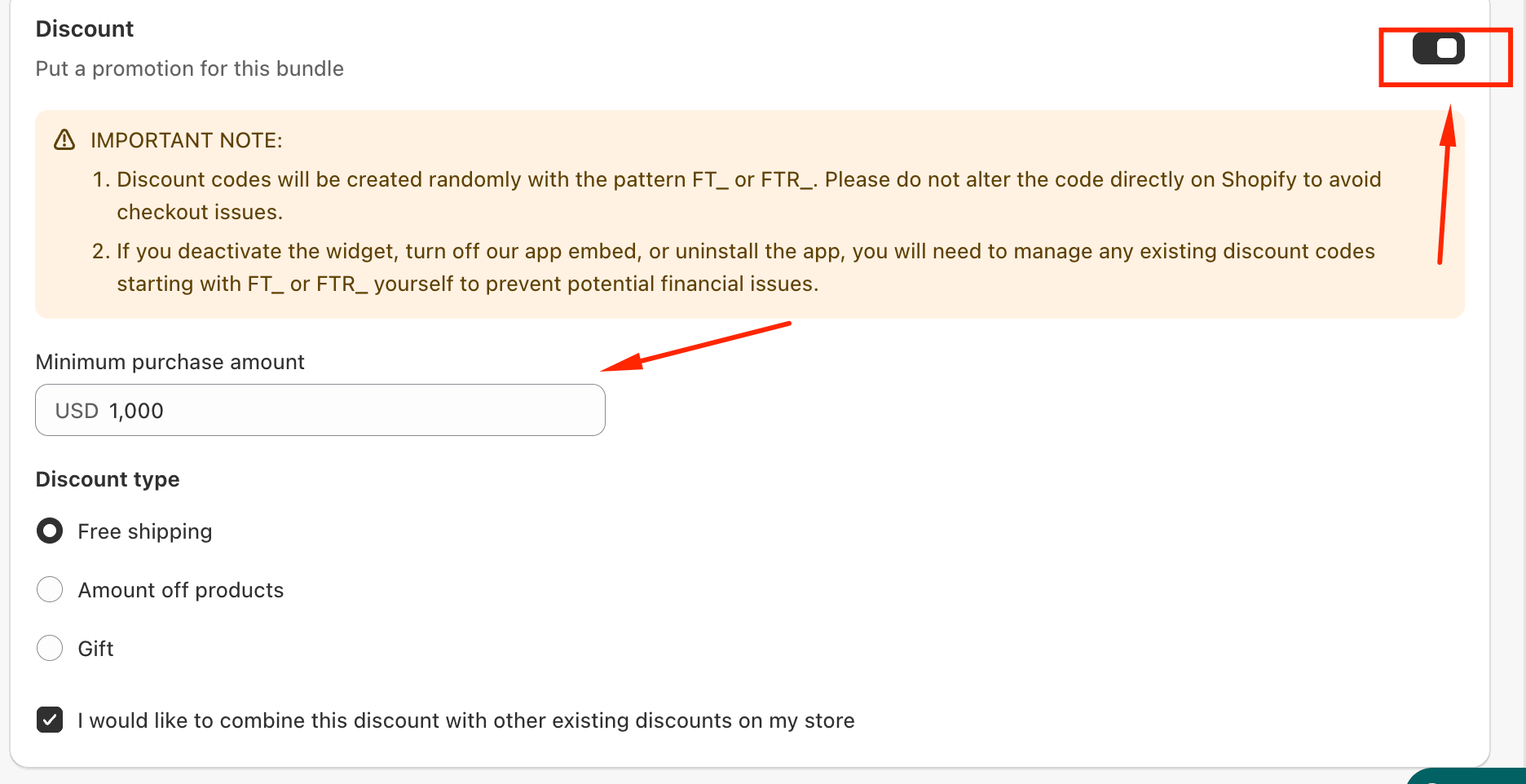 At present, the Discount option—and therefore the Minimum purchase amount feature—is available only for bundles created using the “Specific products” bundle type.