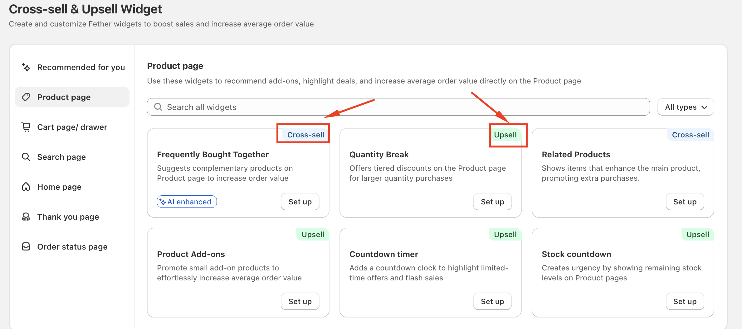 On the Product page, each widget is labeled as either Cross-sell or Upsell. These tags indicate the primary goal of the widget—how it helps increase sales and average order value.