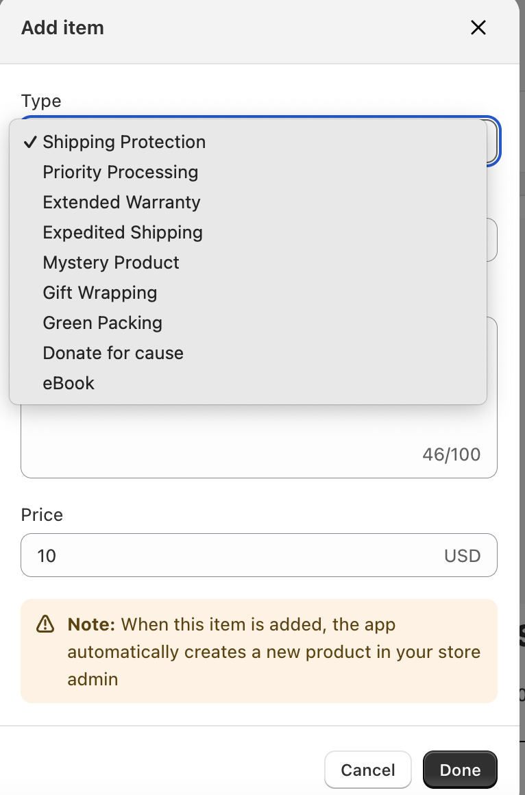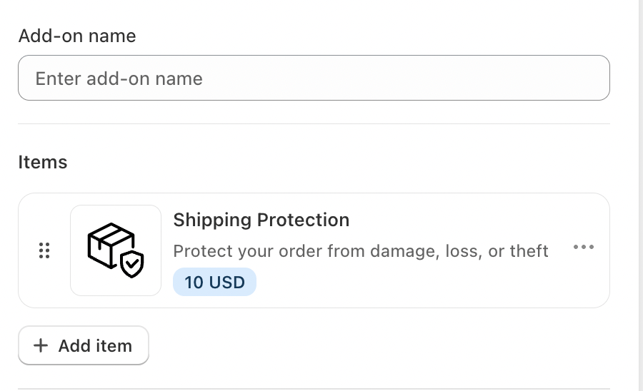 Enter a clear and customer-friendly name for your add-on. This name may be visible to customers, so keep it short and descriptive (e.g., Shipping Protection).