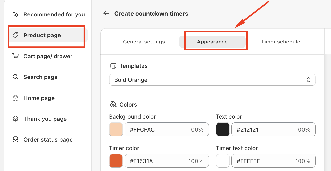The Appearance settings allow you to fully control how your countdown timer looks and feels on the product page. By choosing the right template, adjusting colors, and placing the timer strategically, you can create a visually compelling countdown that reinforces urgency without disrupting the shopping experience.