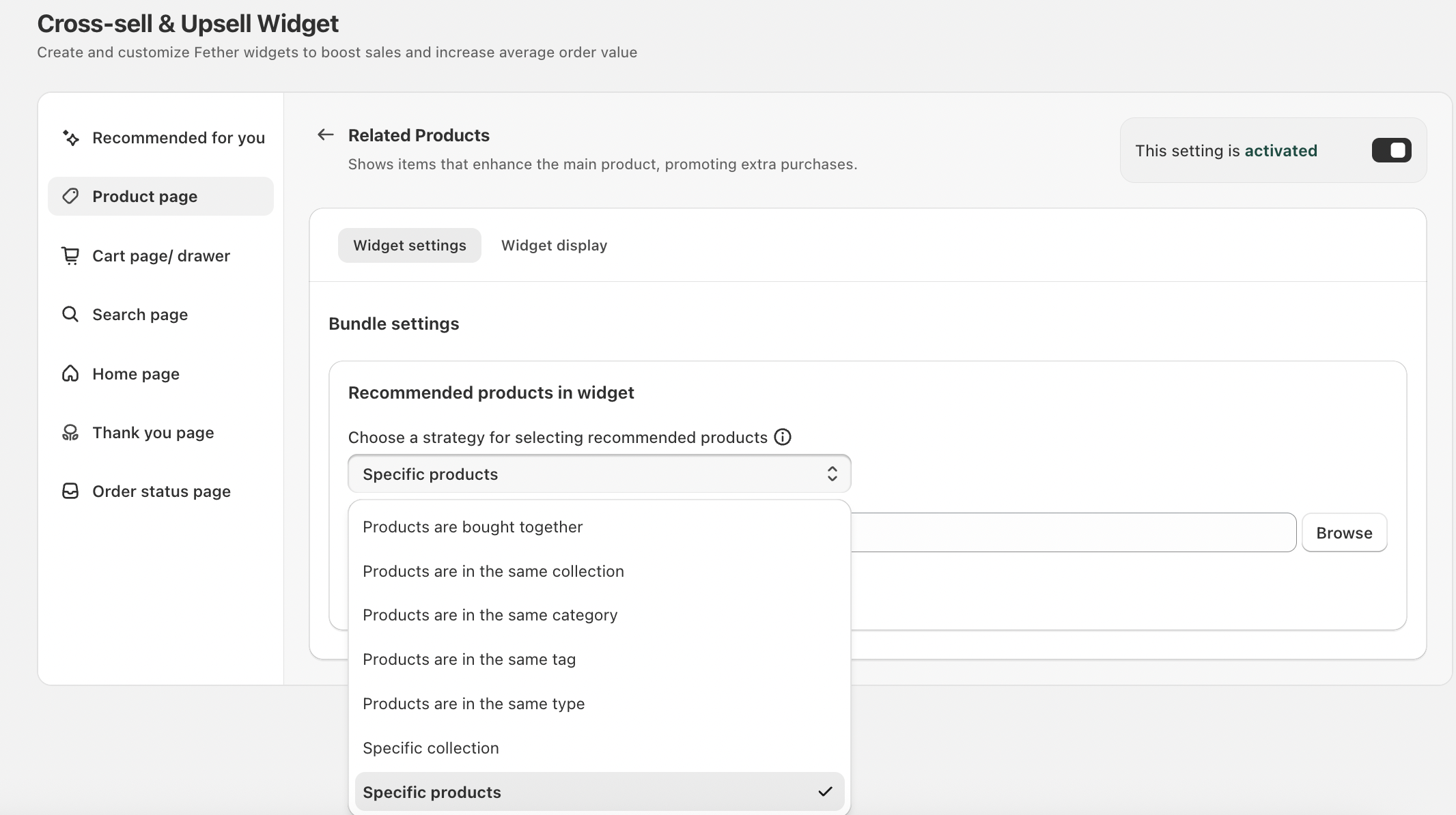 Under Widget settings, you’ll find the Bundle settings section. This is where you decide how Fether selects products to recommend.