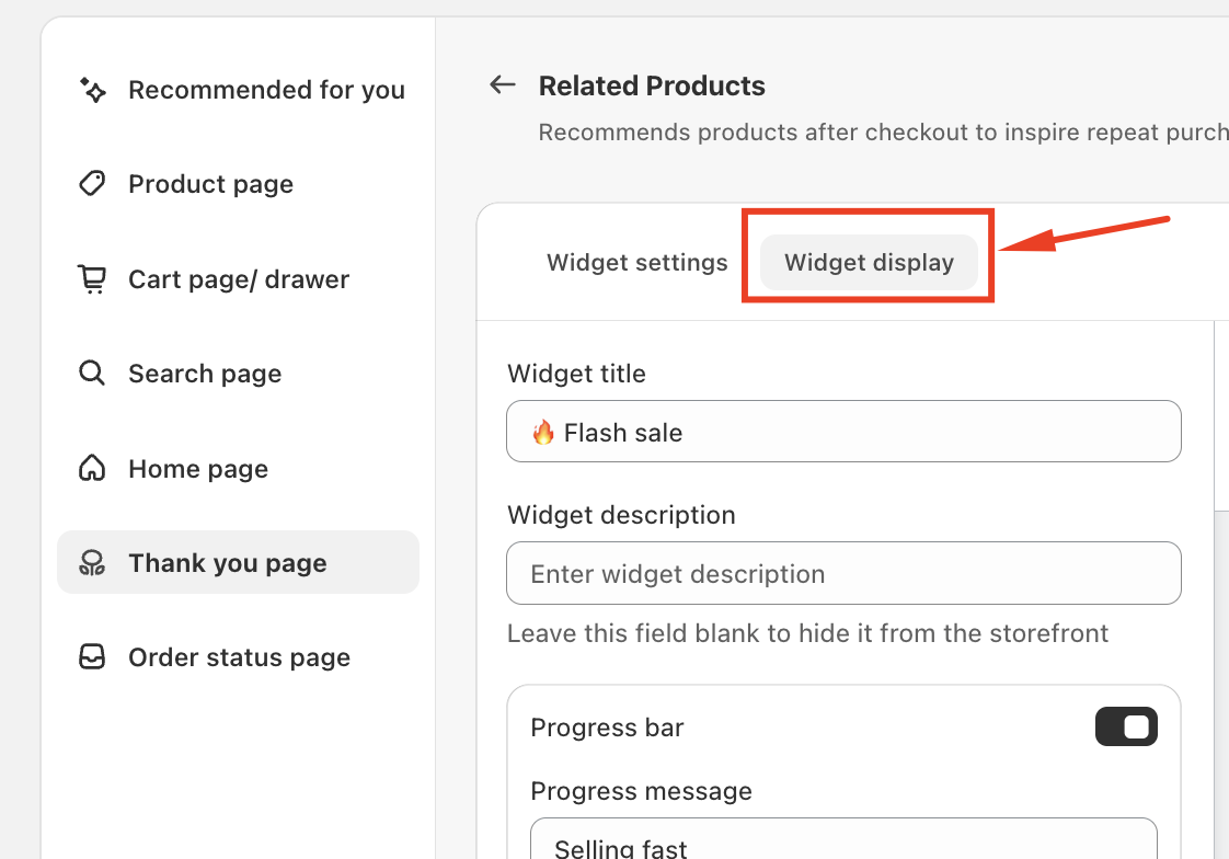 The Related Products widget on the Thank You page allows you to personalize post-purchase recommendations and encourage repeat buying. By adjusting its display settings, you can control how the widget looks, what it communicates, and how it drives customer engagement.