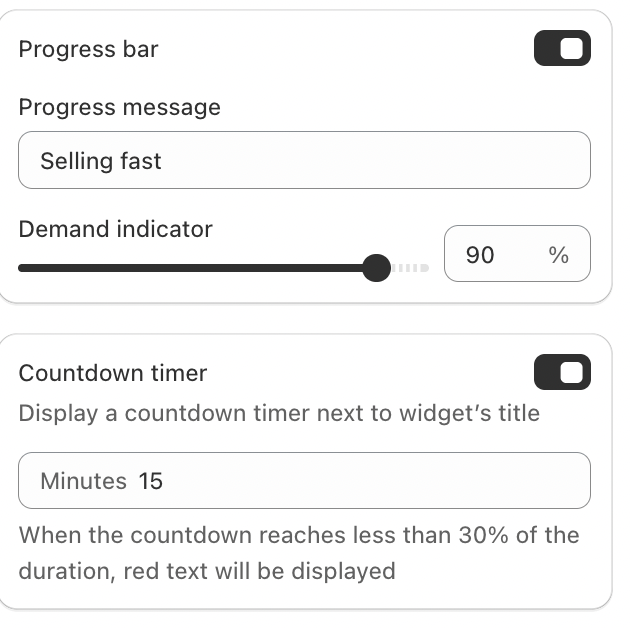 Turn on the countdown timer to display a timer next to the widget title. This is useful for limited-time promotions or special offers.