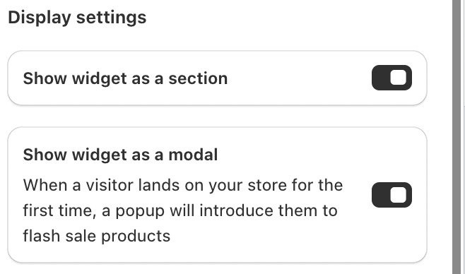 The Flash Sale widget is designed to highlight time-limited deals on the Home page, helping create urgency and drive quick purchasing decisions. By customizing its display settings, merchants can control how the widget appears, how it’s introduced to visitors, and how strongly it communicates urgency.