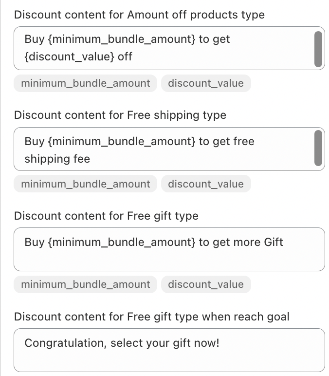 The widget supports multiple discount types, each with fully customizable messaging. Messages automatically update based on your discount rules.